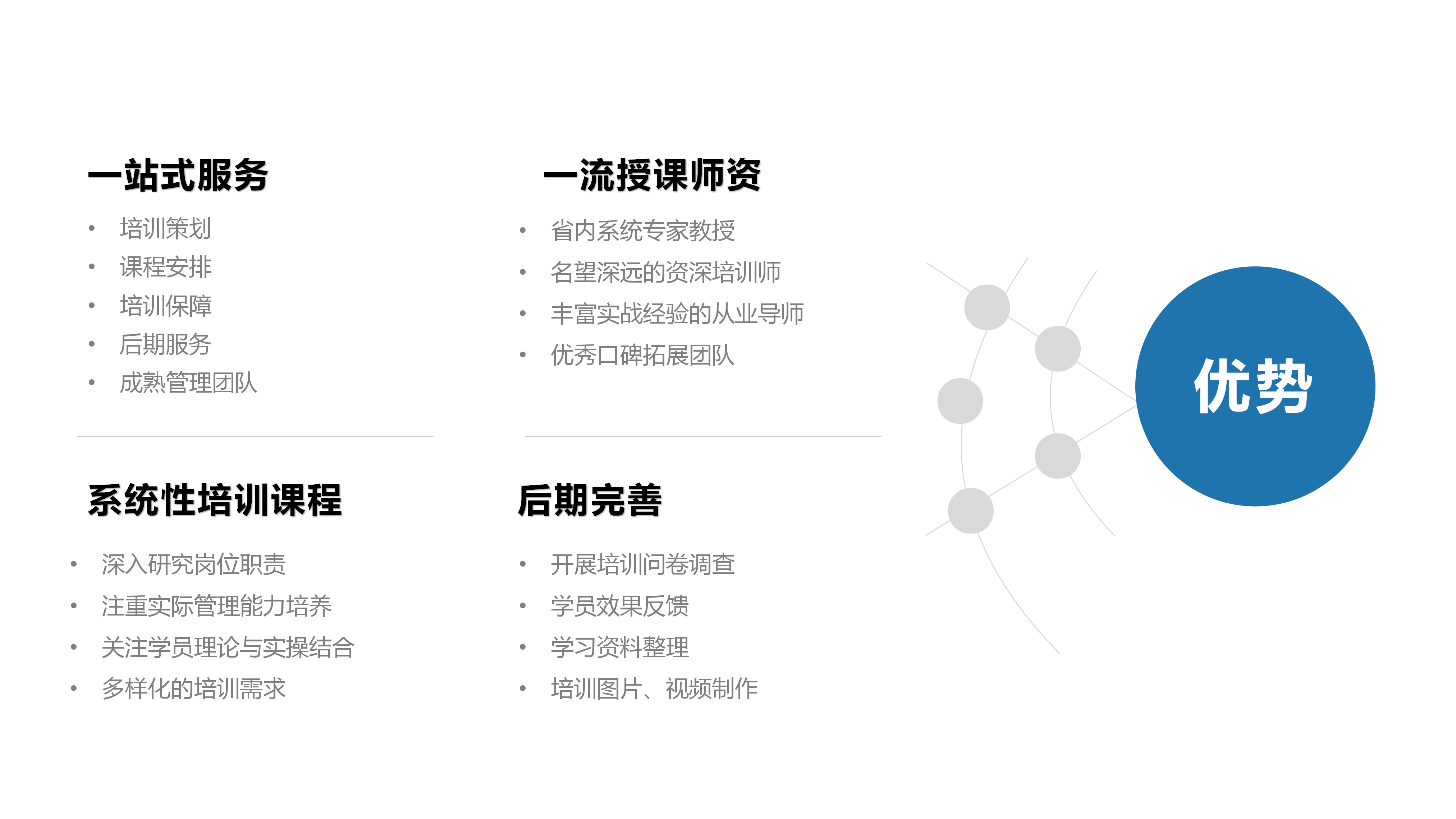 培訓服務項目從制訂培訓方案、提供會場服務、個性化課程設計、培訓期間交通餐飲住宿整體服務、學員觀摩參觀、學員反饋、命題測試等方面不斷延伸。